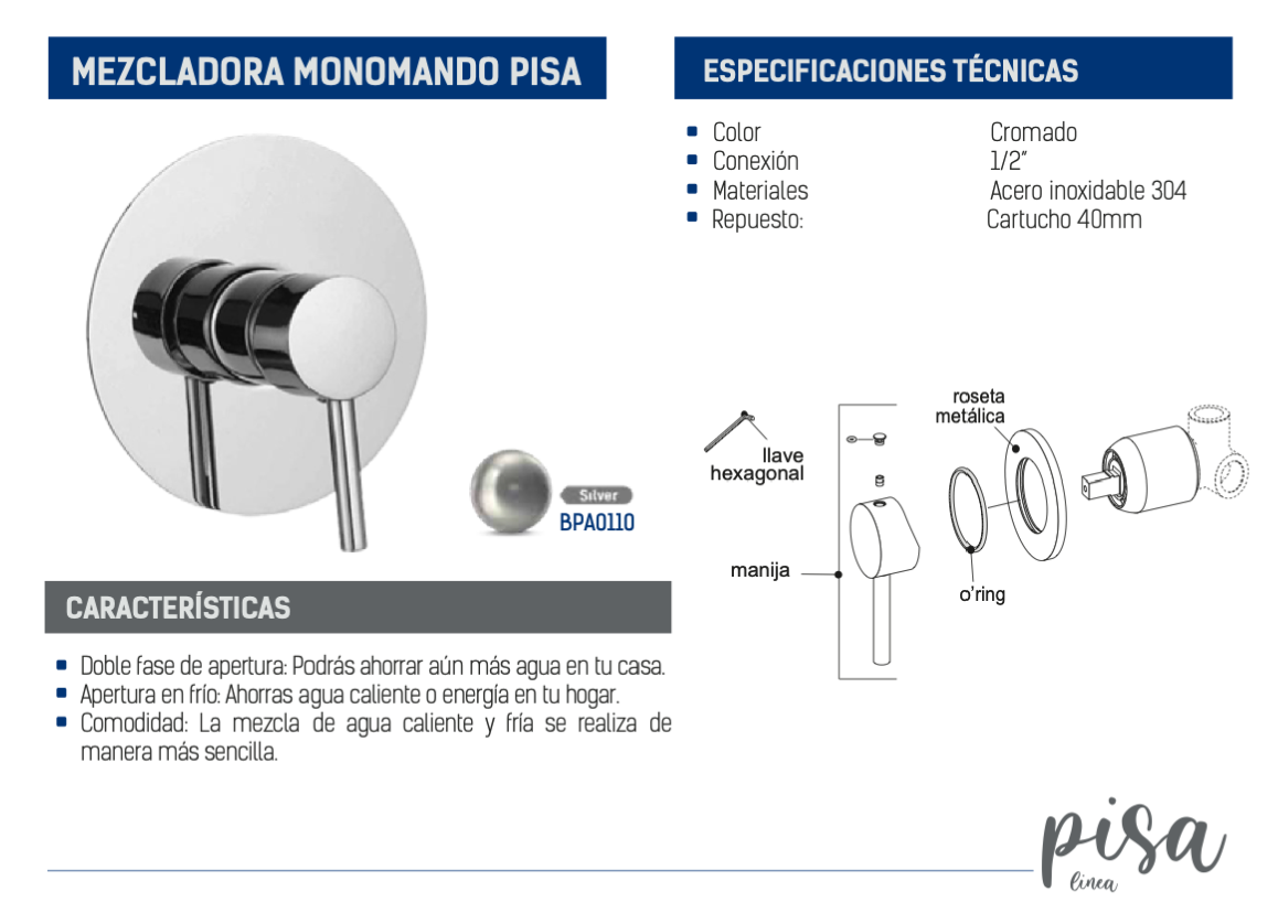 - Componentes: Mezcladora monomando, embellecedor circular, manija
