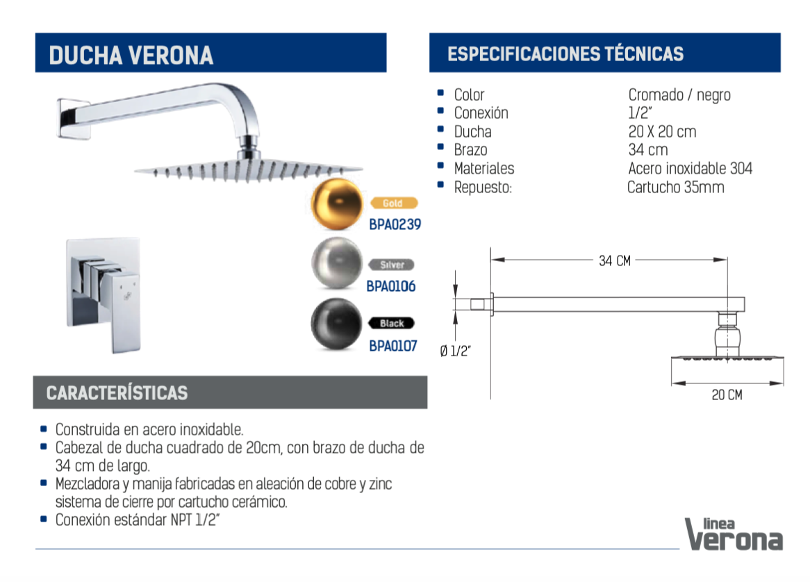 - Cabezal de ducha cuadrado de 20cm, con brazo de ducha de 34 cm de largo.