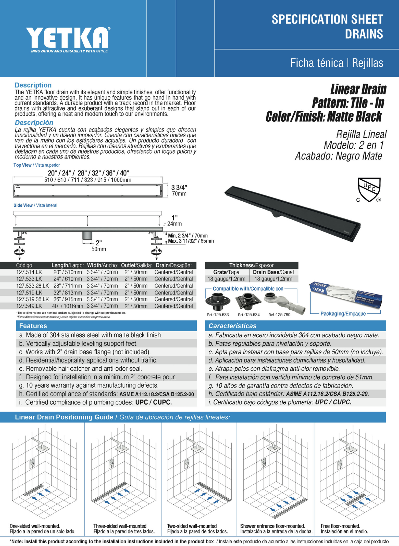 - Su drenaje lineal ofrece una mayor capacidad de evacuación, previniendo acumulación de agua y mejorando la funcionalidad en duchas tipo walk-in, spas, proyectos residenciales o comerciales.