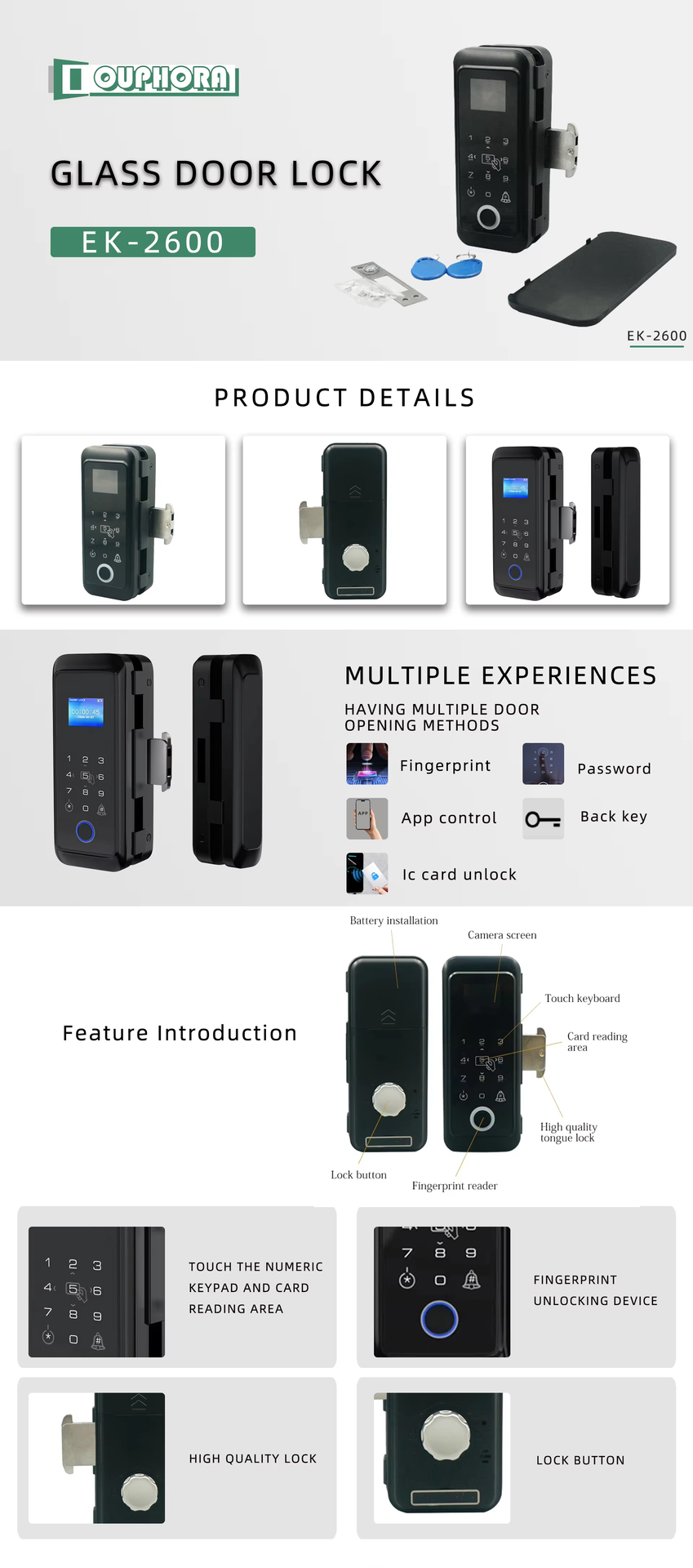 - Múltiples métodos de acceso: huella digital, control de aplicaciones, desbloqueo de tarjeta IC, contraseña, tecla Atrás.