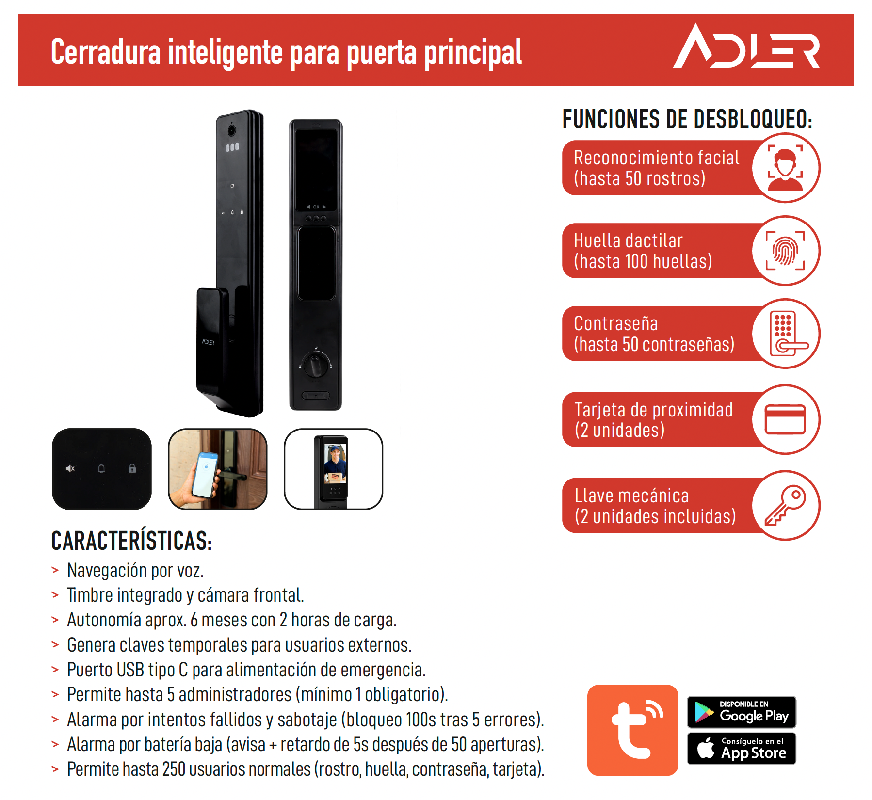 - Permite hasta 250 usuarios normales (rostro, huella, contraseña, tarjeta).