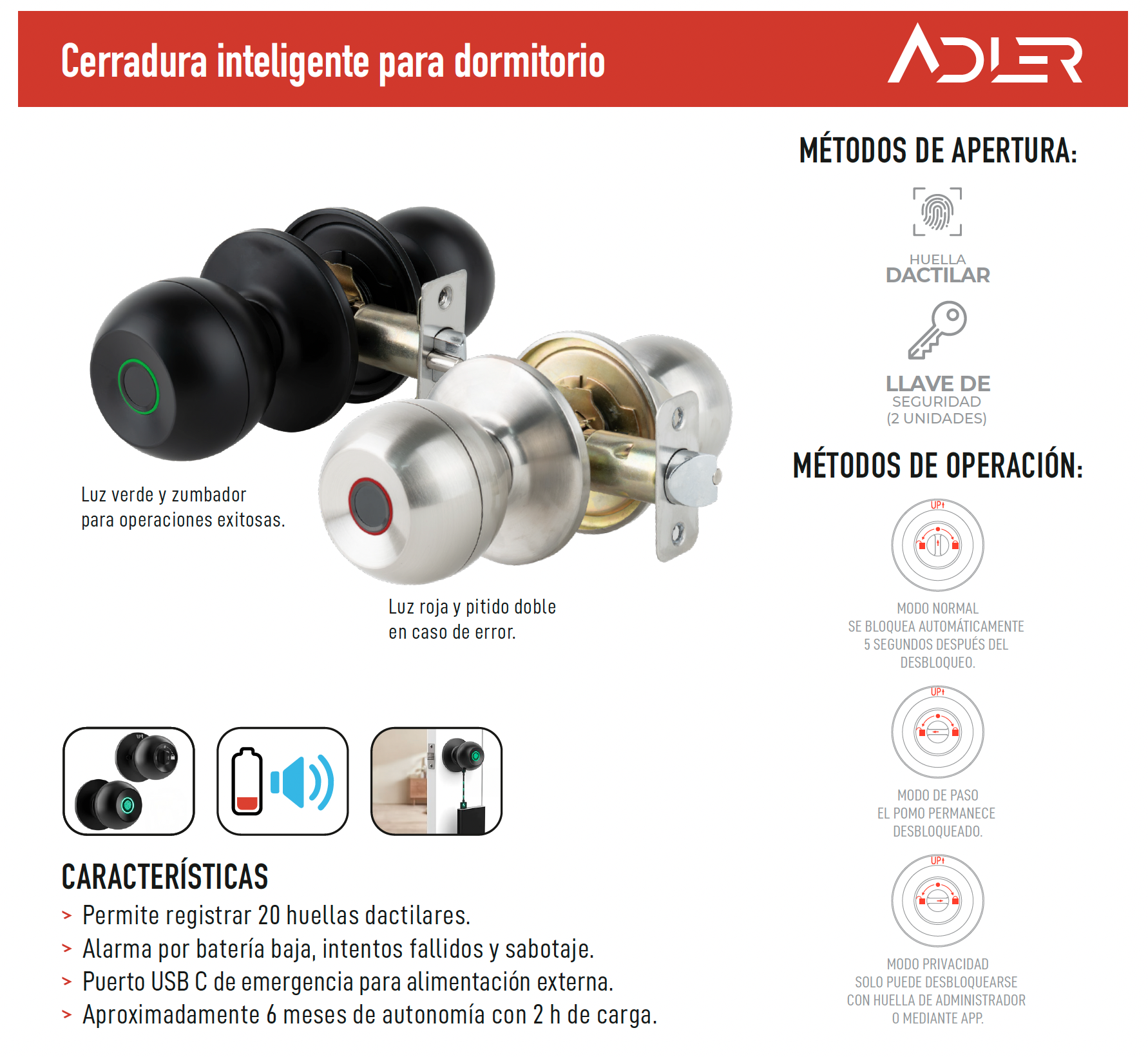 - Alarma por batería baja, intentos fallidos y sabotaje.
