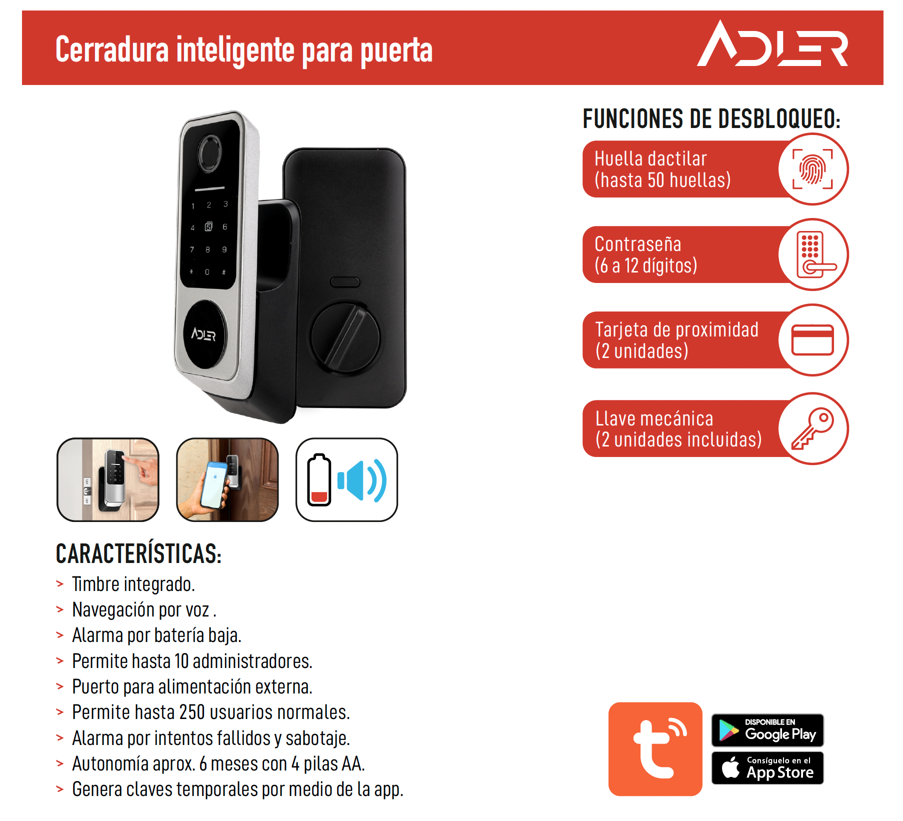 - Alarma por intentos fallidos y sabotaje.