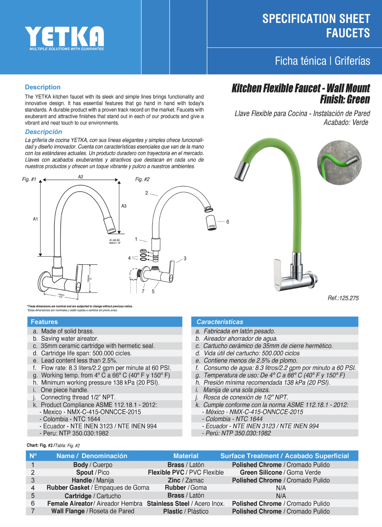- Compatible con conexiones estándar de pared 1/2” NPT y certificada bajo normas internacionales ASME 112.18.1, NMX, NTC, INEN y NTP.