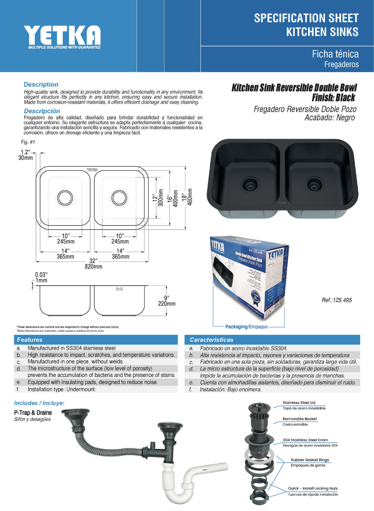 - El fregadero reversible doble pozo YETKA de 82×46 cm está fabricado en acero inoxidable de alta resistencia.