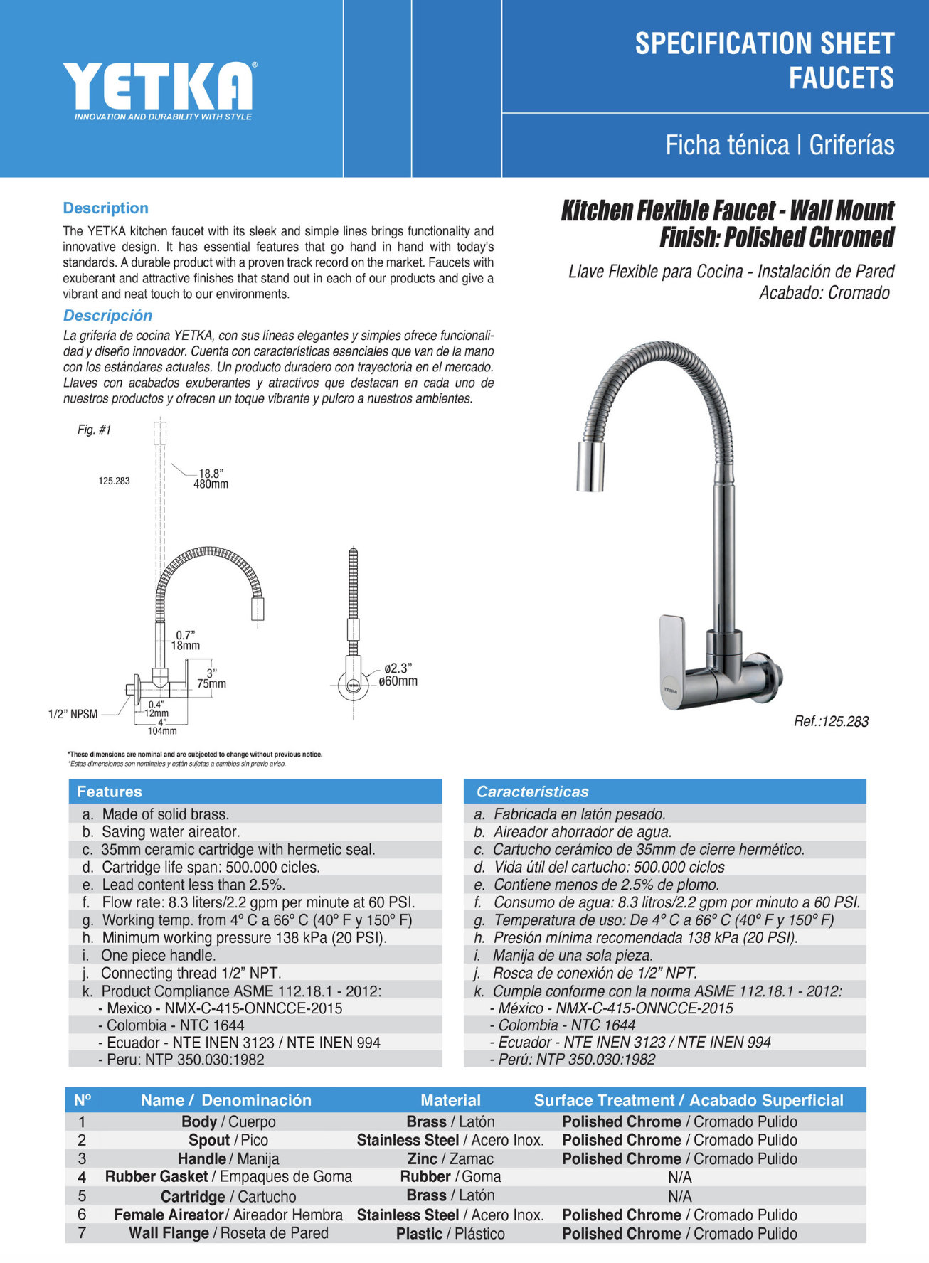- Compatible con conexiones estándar de pared 1/2” NPT y certificada bajo normas internacionales ASME 112.18.1, NMX, NTC, INEN y NTP.