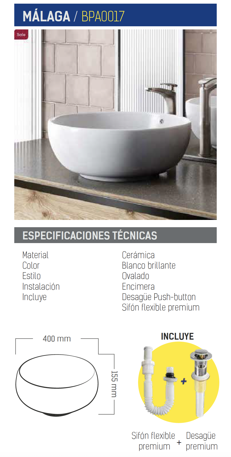 - Diseño ovalado, ideal para mobiliario de baño con porcelana premium.