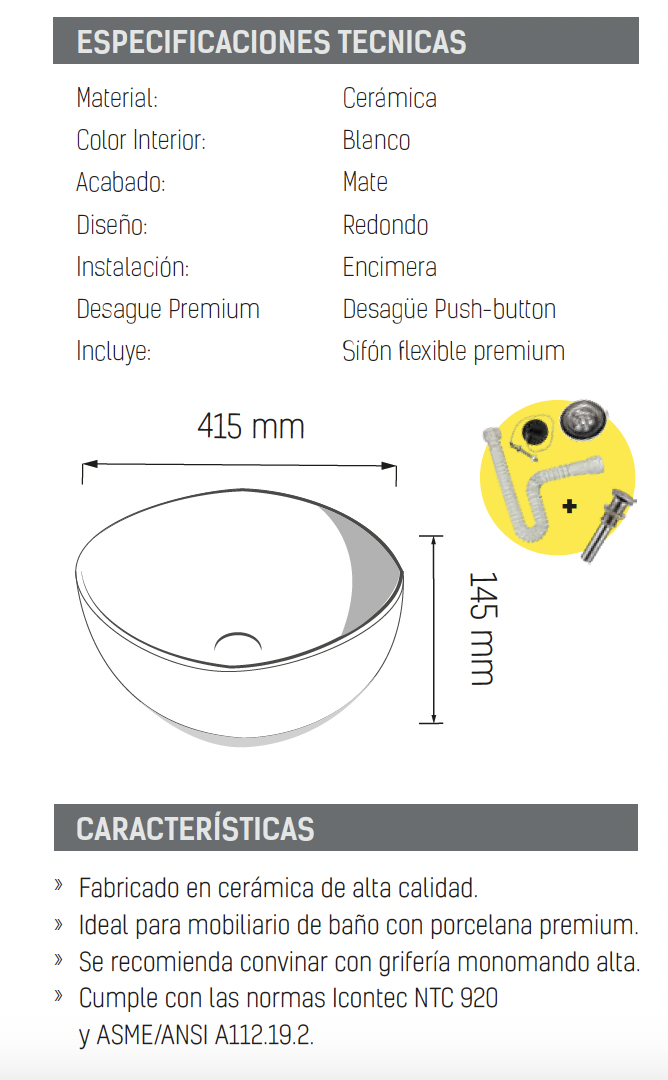 - Cumple con las normas Icontec NTC 920 y ASME/ANSI A112.19.2