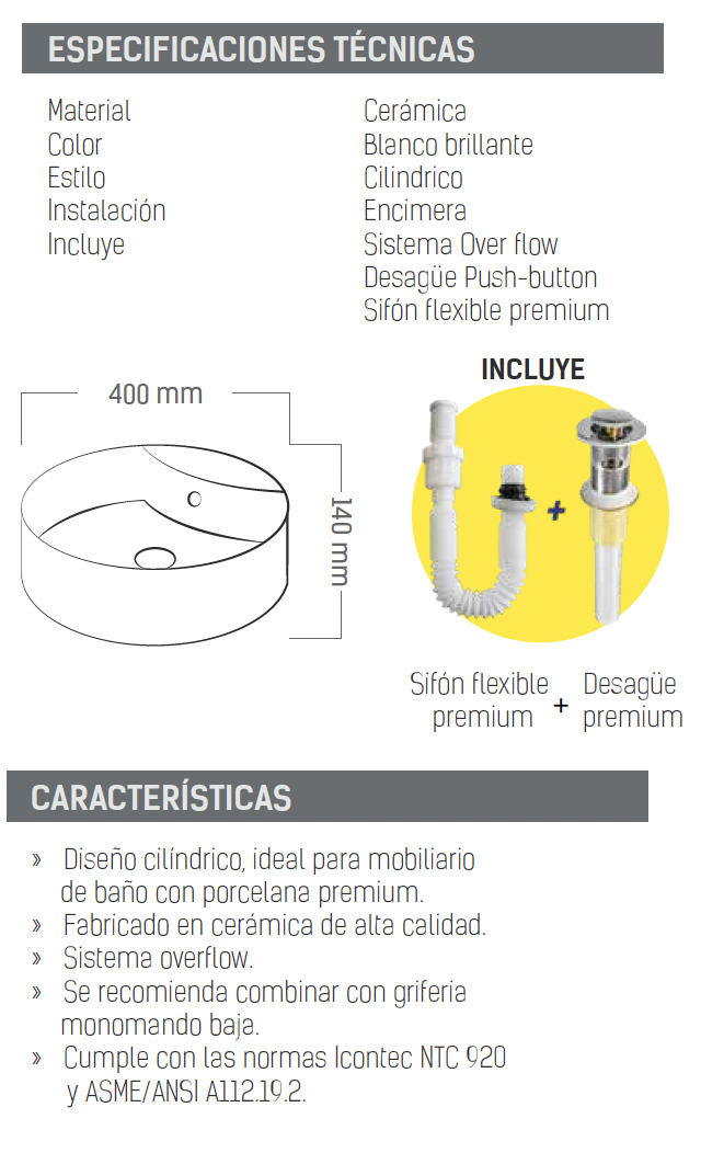 - Cumple con las normas Icontec NTC 920 y ASME/ANSI A112.19.2.