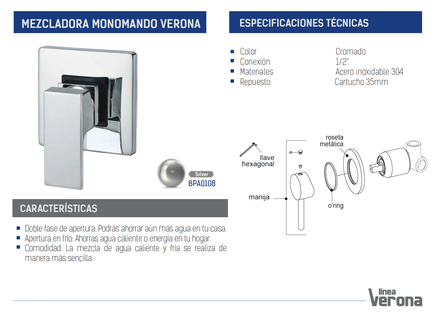 - Componentes: Mezcladora monomando, embellecedor cuadrado, manija