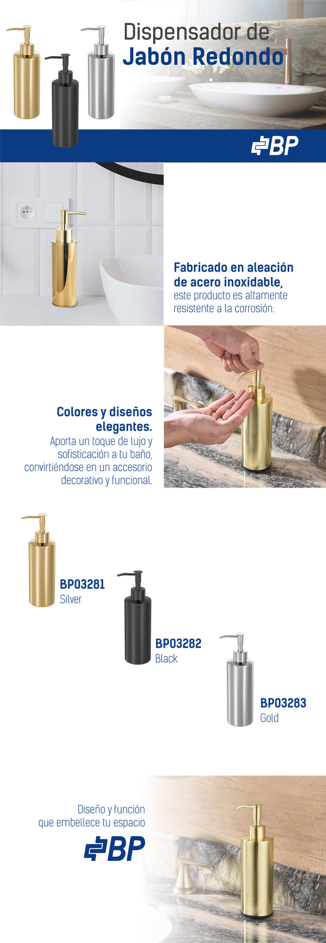 - Dispensador de jabón con acabado redondeado, ideal para complementar tu ambiente.