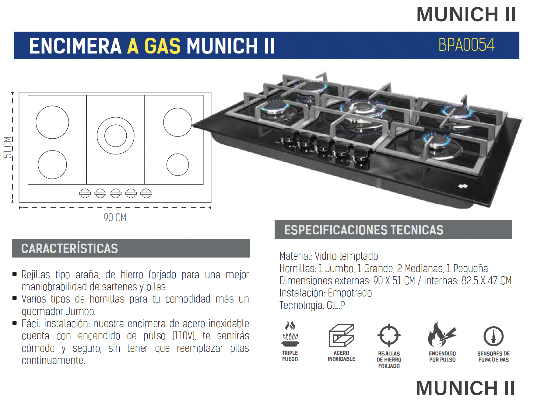 - Rejillas tipo araña, de hierro forjado para una mejor maniobrabilidad de sartenes y ollas.