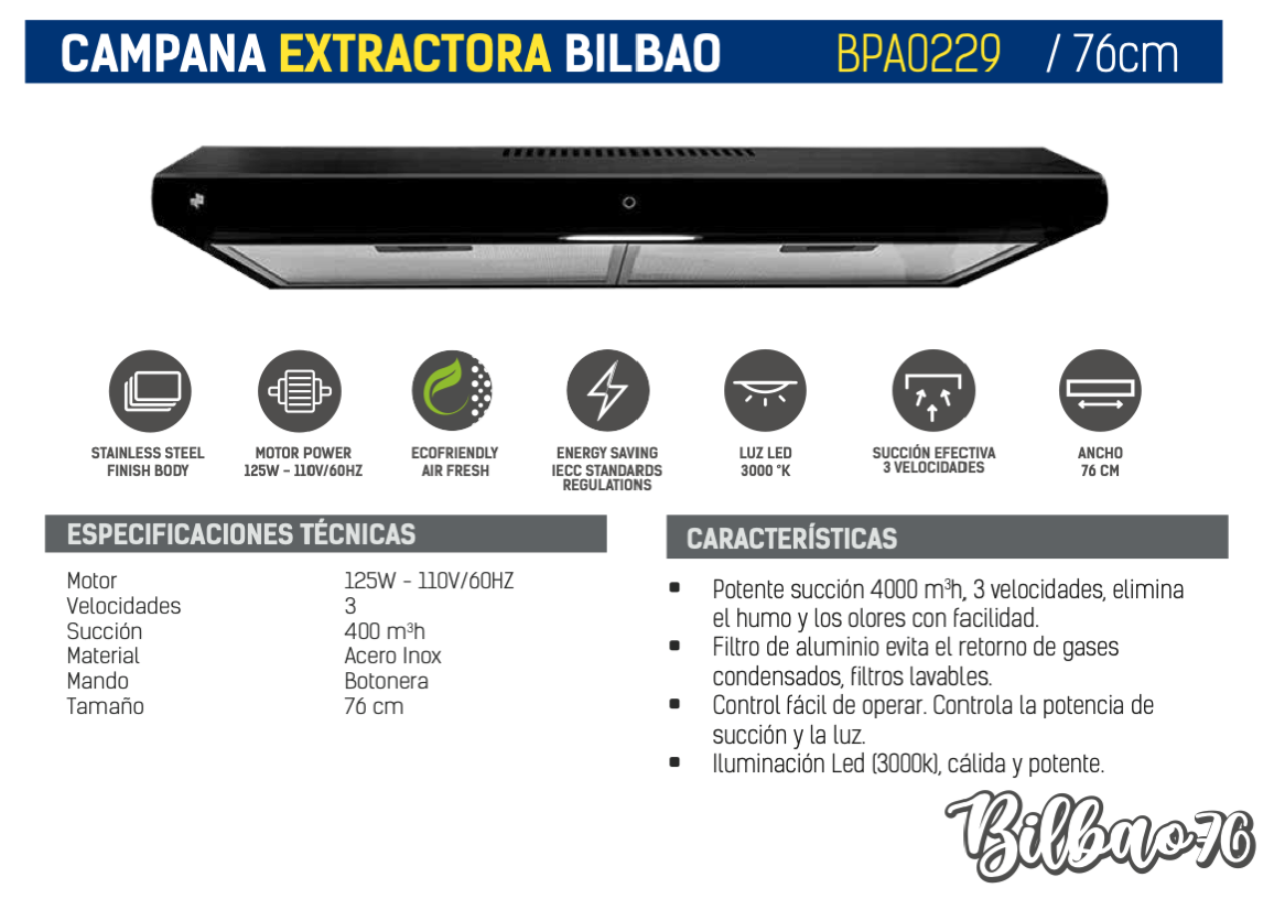 GPL0373 BEELEE CAMPANA EXTRACTORA BILBAO 76 125W