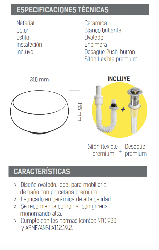 - Cumple con las normas Icontec NTC 920 y ASME/ANSI A112.19.2.