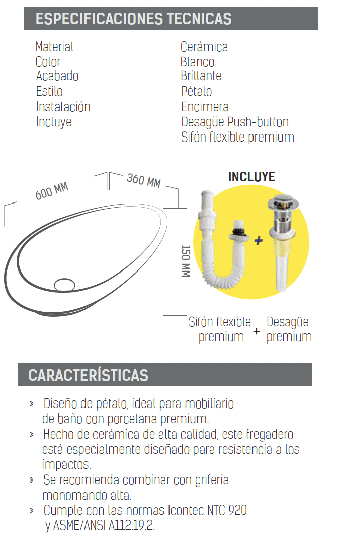 - Cumple con las normas Icontec NTC 920 y ASME/ANSI A112.19.2.
