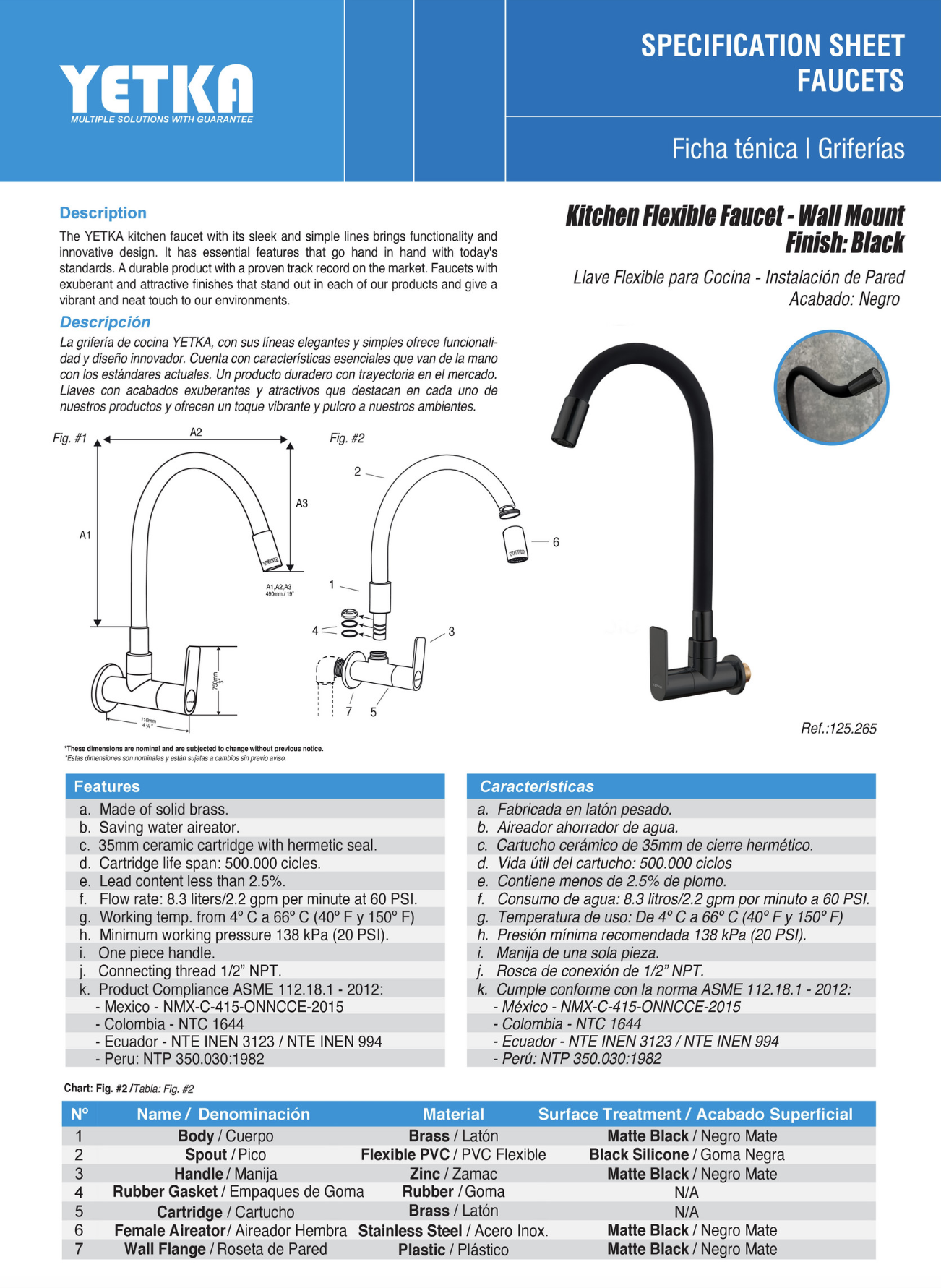 - Compatible con conexiones estándar de pared 1/2” NPT y certificada bajo normas internacionales ASME 112.18.1, NMX, NTC, INEN y NTP.