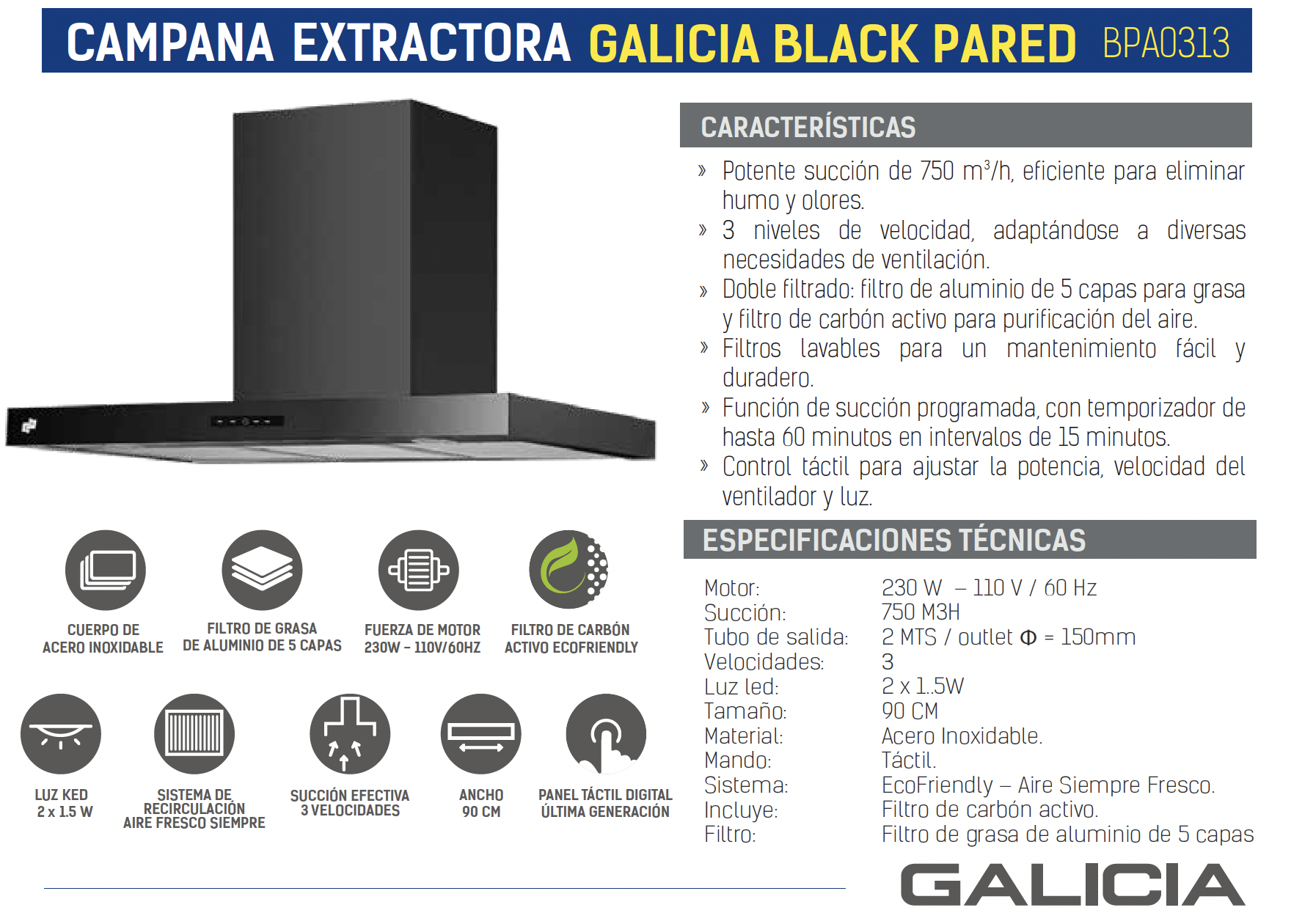 - Doble filtrado: filtro de aluminio de 5 capas para grasa y filtro de carbón activo para purificación del aire.