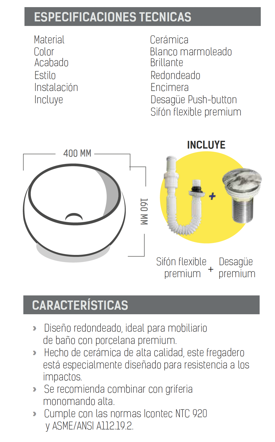 - Cumple con las normas Icontec NTC 920 y ASME/ANSI A112.19.2.