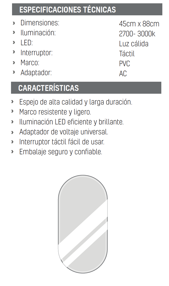 GPL0861 BEELEE ESPEJO C/LUZ ECLIPSE - LUZ CALIDA (OVALADO) - 45x90cm