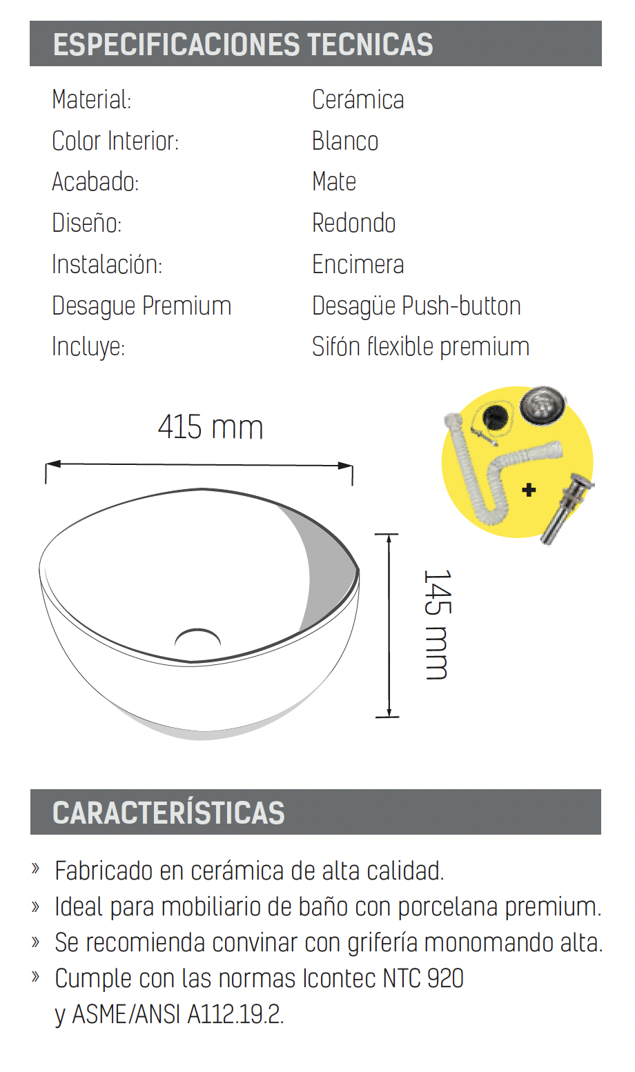 - Cumple con las normas Icontec NTC 920 y ASME/ANSI A112.19.2