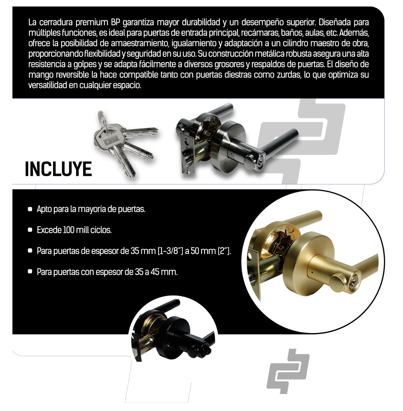 - Construcción metálica robusta, asegura una alta resistencia a golpes y se adapta a diversos grosores de puertas.